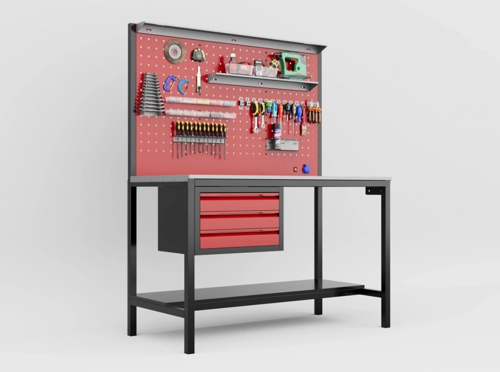 Üst Panel (Pegboard): Tezgahın arka kısmında, el aletlerinin asılarak düzenli bir şekilde sergilenmesini ve kolayca erişilmesini sağlayan delikli alet panosu (pegboard) yer alır.
