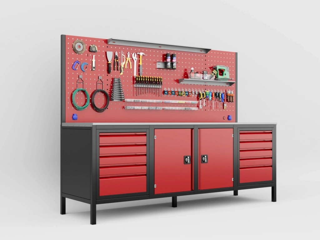 Tam Boy Pano: 190 cm toplam yüksekliğin büyük bir kısmını kaplayan geniş perfore pano, tezgah üzerindeki dağınıklığı sıfıra indirir ve en sık kullanılan aletlerin anında erişilebilir olmasını sağlar.